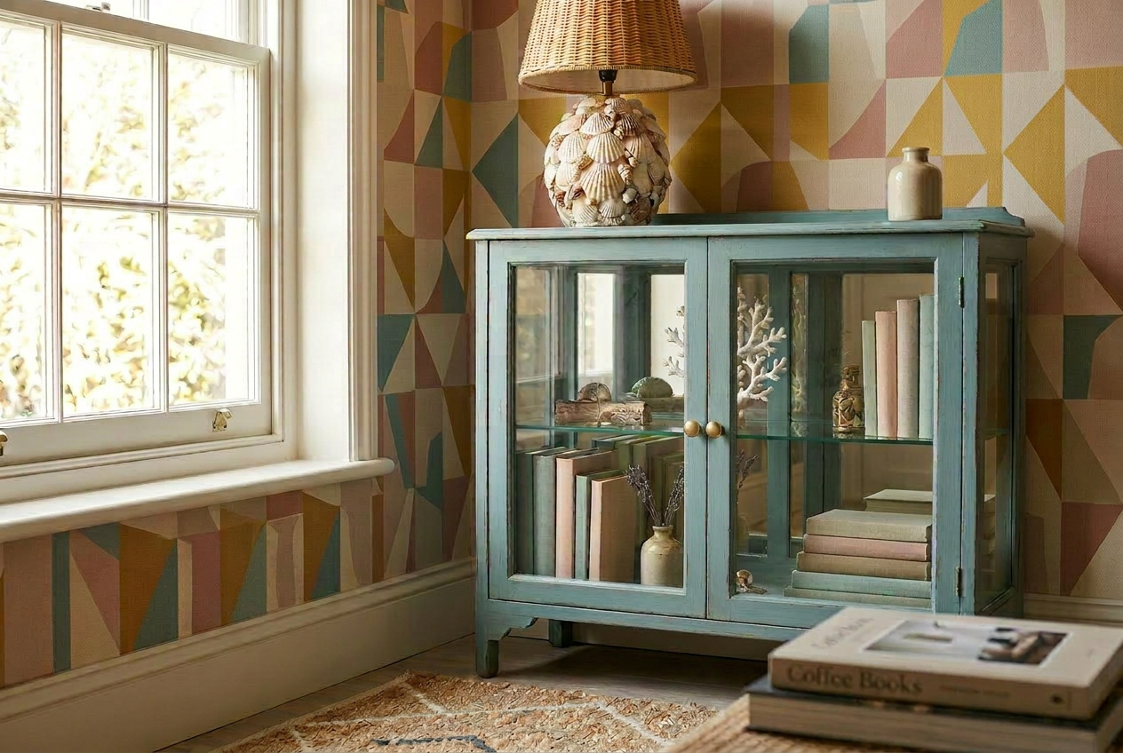 In this home, walls are anything but neutral. Retro inspired wallpaper with bold geometric shapes, arches, and curves sets the tone and acts as a vibrant backdrop for a collection of rescued furniture. Each pattern is carefully chosen to create rhythm and energy, giving the rooms personality without overwhelming the space. The wallpaper isn’t just decoration; it’s a stage where the vintage pieces take centre stage.