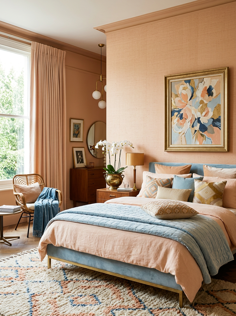 Glamorous retro bedroom with woven textured wallpaper and rescued vintage furniture