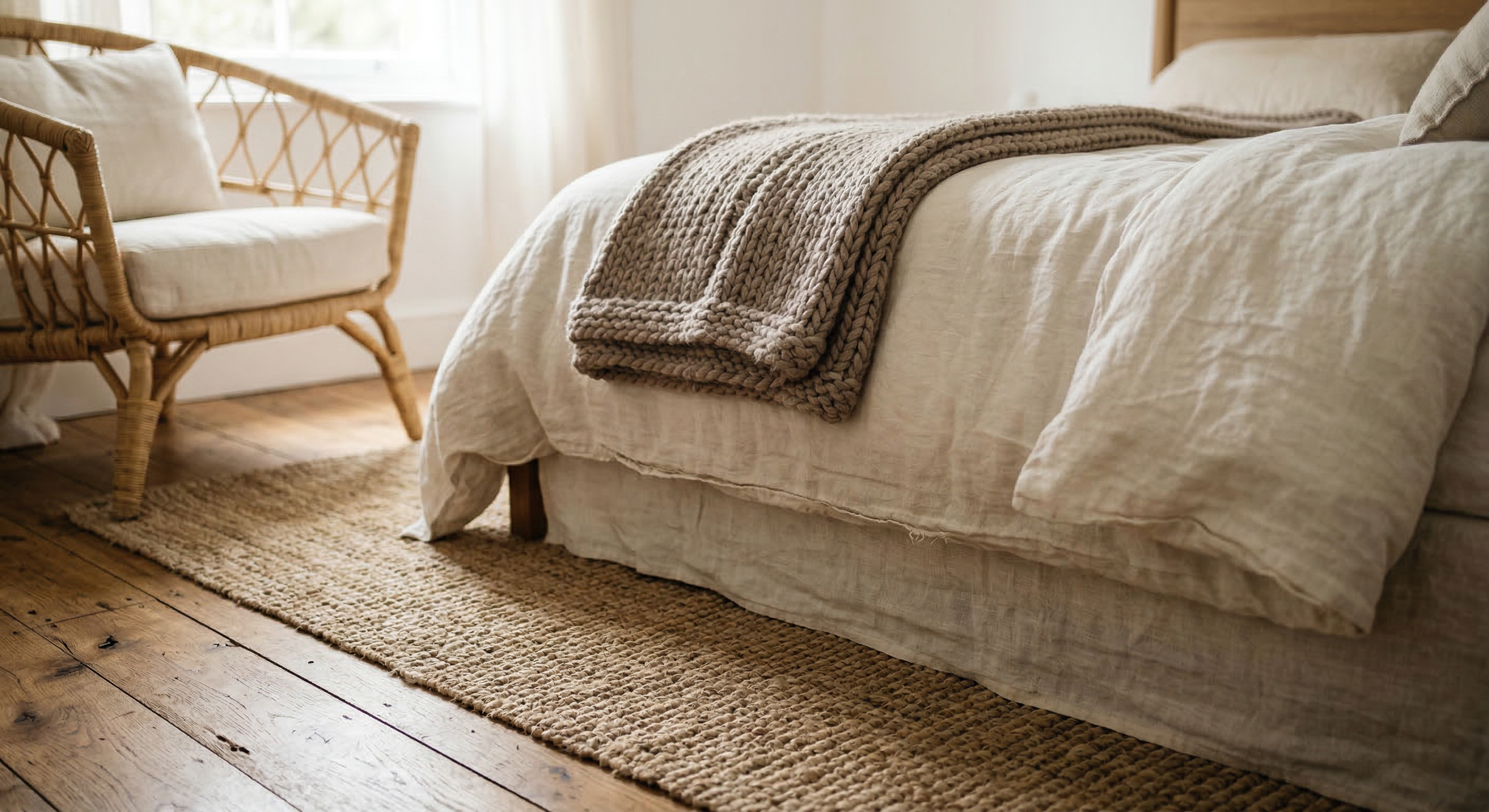 Natural fibres mellow a room and add gentle visual texture. Little treasures gathered on countryside rambles, a few long twigs in a tall vase for drama, or a small bouquet of bluebells or daisies in a vintage glass, bring spring indoors and the pleasant memory of a day out. Sisal rugs give earthy, practical comfort underfoot, while linen curtains let daylight filter in softly. Bamboo and rattan furniture or woven baskets introduce an easy, organic feel that’s relaxed rather than formal. These materials don’t demand attention; they quietly create a balanced, calming space.